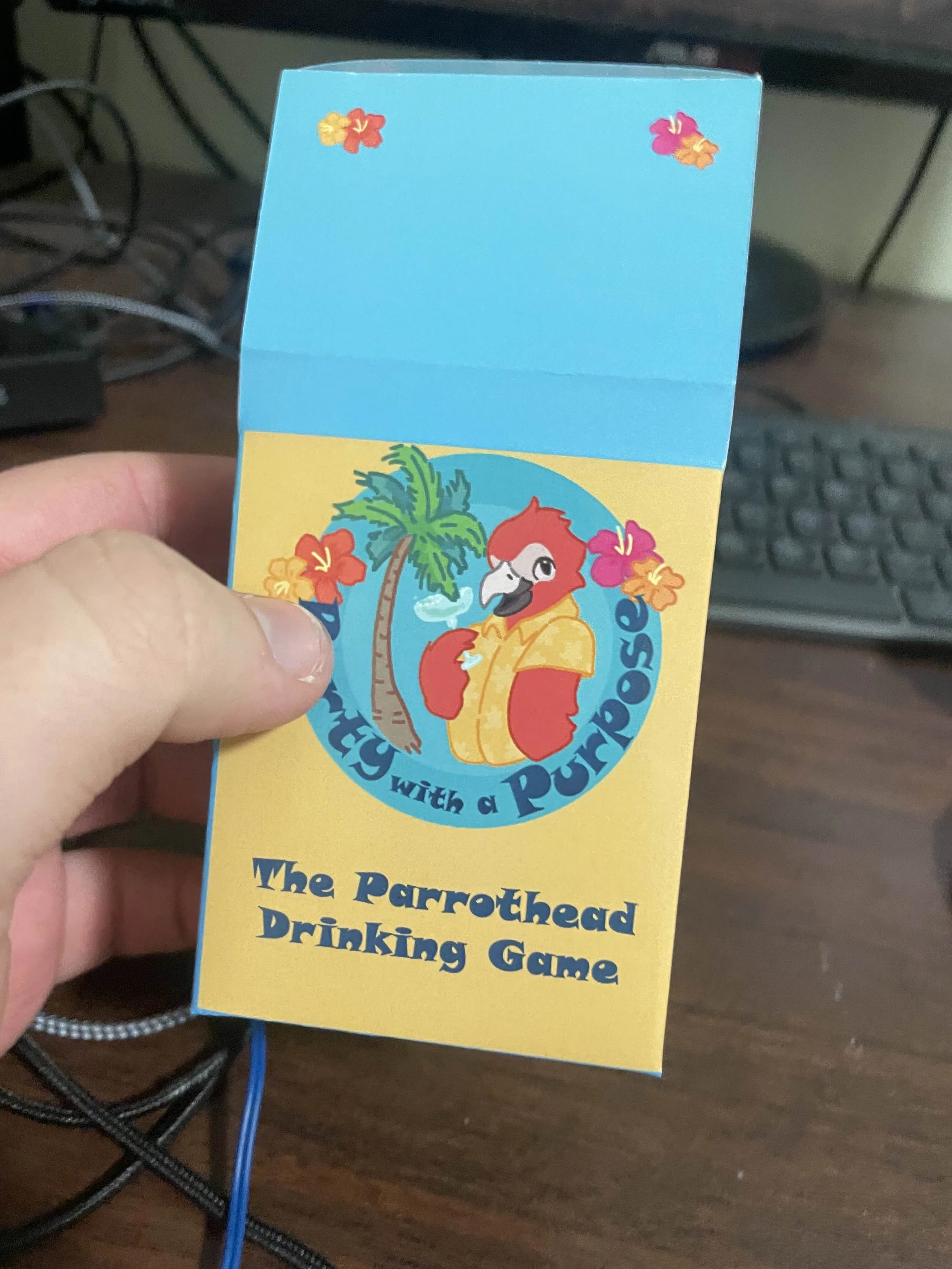 From here, I wrote 50 different prompts, had a friend make some art for me, and got the game officially produced. At the April 2025 Chicago Parrothead meeting, I gave them the finished, shiny, produced game.